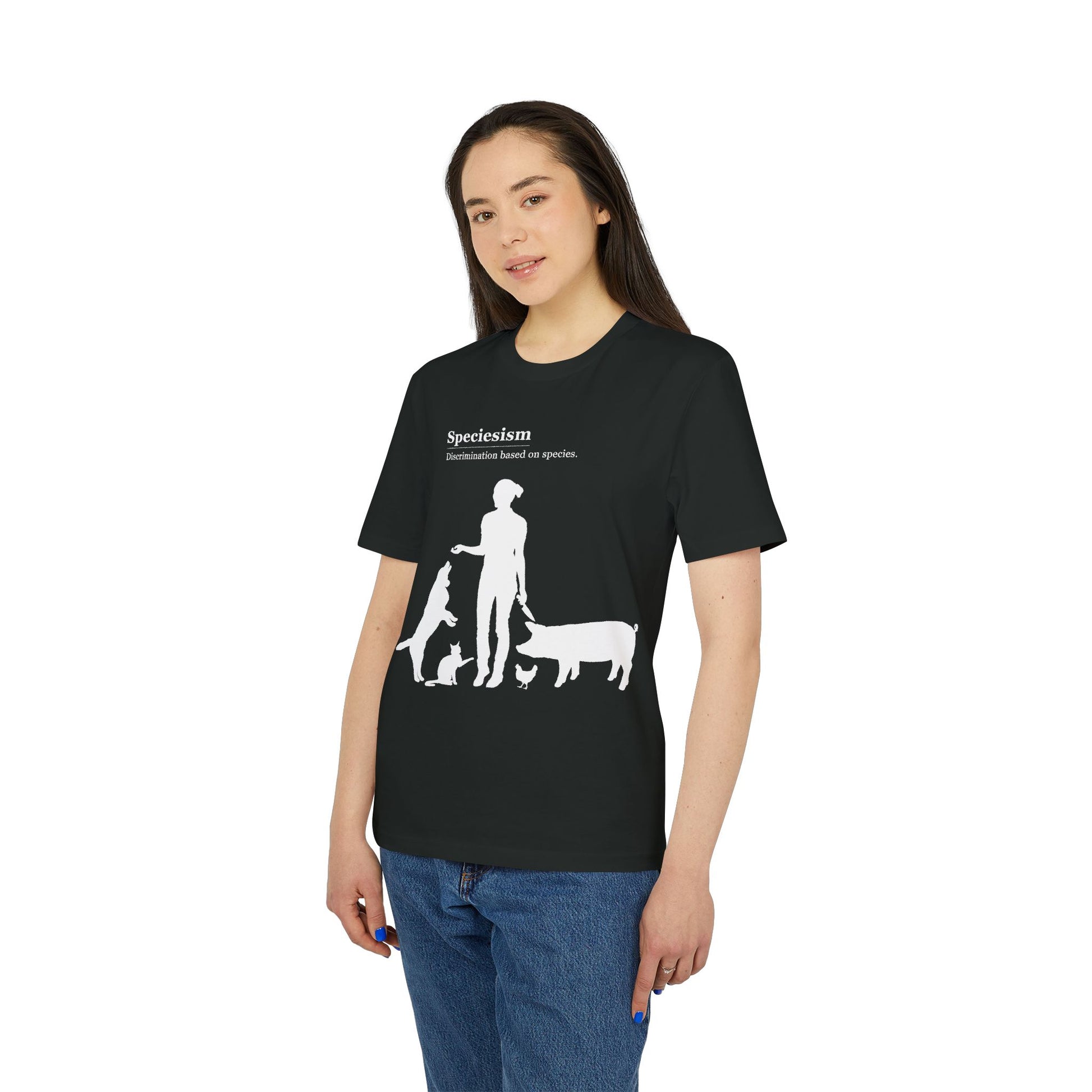 Speciesism Definition - Unisex T-Shirt - Woman with Dog, Cat, Pig, and Chicken