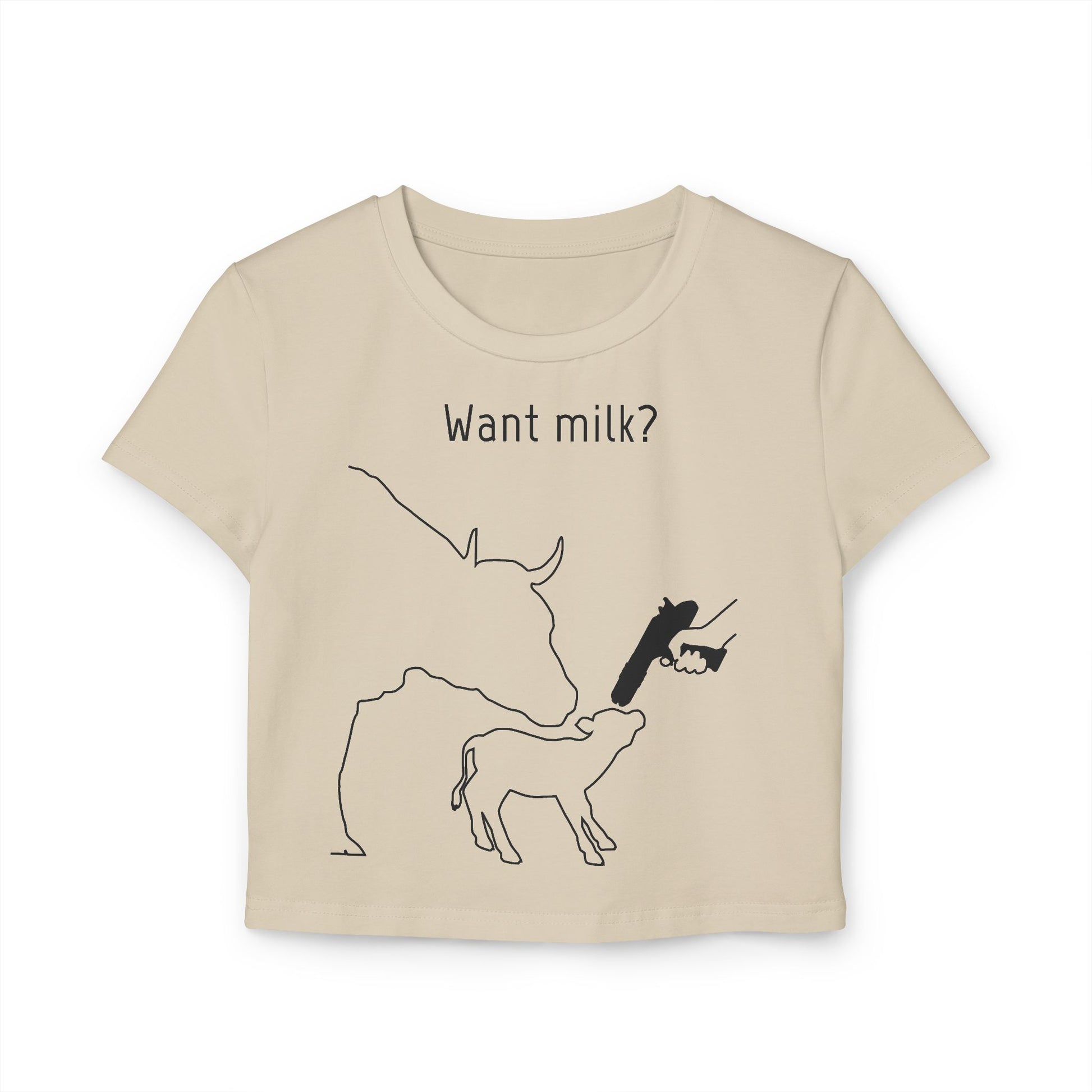 This crop tee shows a powerful design confronting consumers of cows milk on what is happening in the milk industry. The text above ''Want milk?'' is raised as a question to set people's minds to think while the design itself will not easily be forgotten by the average milk-consumers.