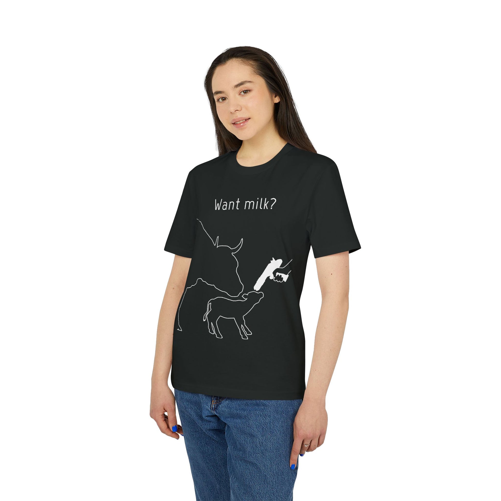 This T-Shirt shows a powerful design confronting consumers of cows milk on what is happening in the milk industry. The text above ''Want milk?'' is raised as a question to set people's minds to think while the design itself will not easily be forgotten by the average milk-consumers.