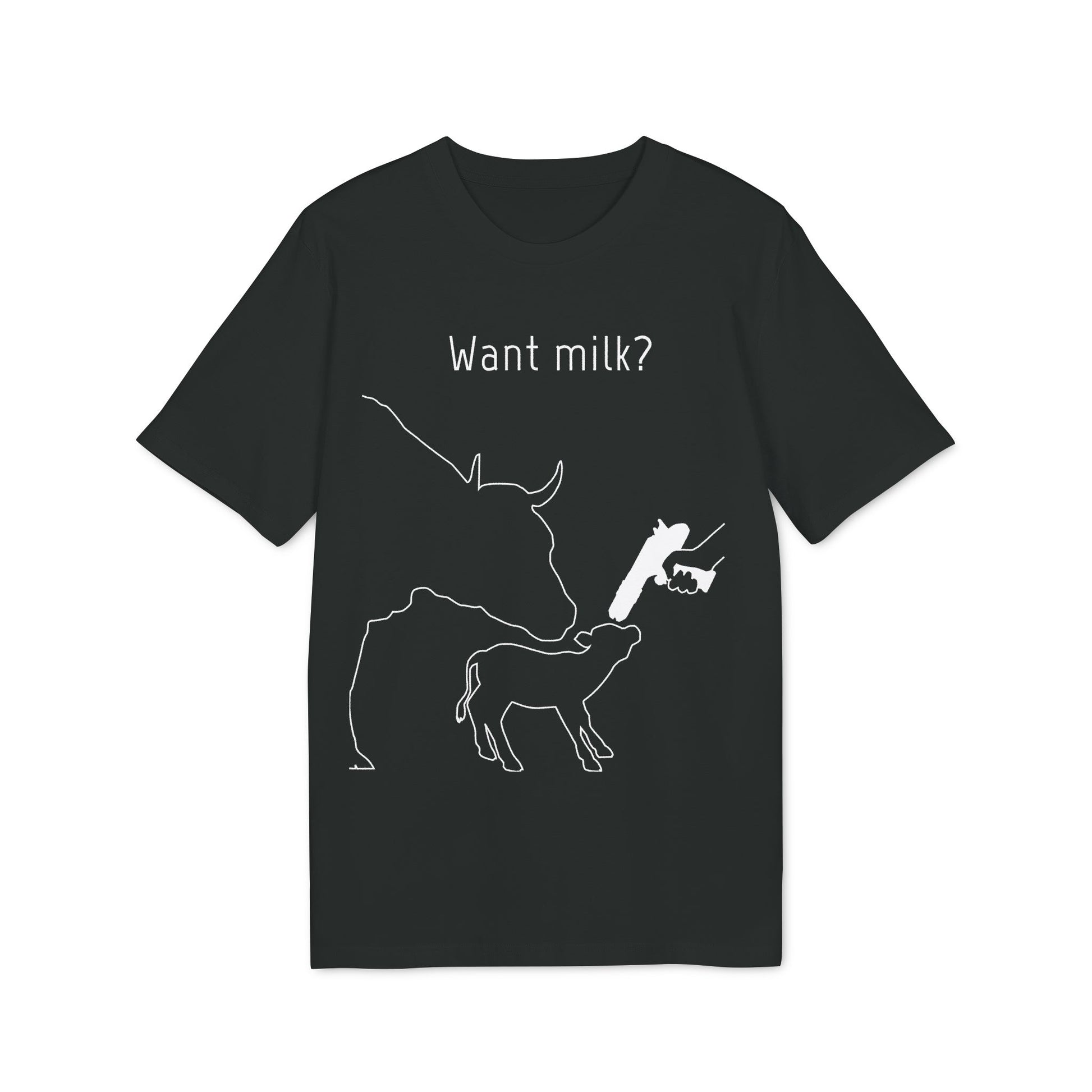 Want Milk? - Unisex T-shirt - Confronting Milk consumers with Mother Cow, Calf and bolt gun